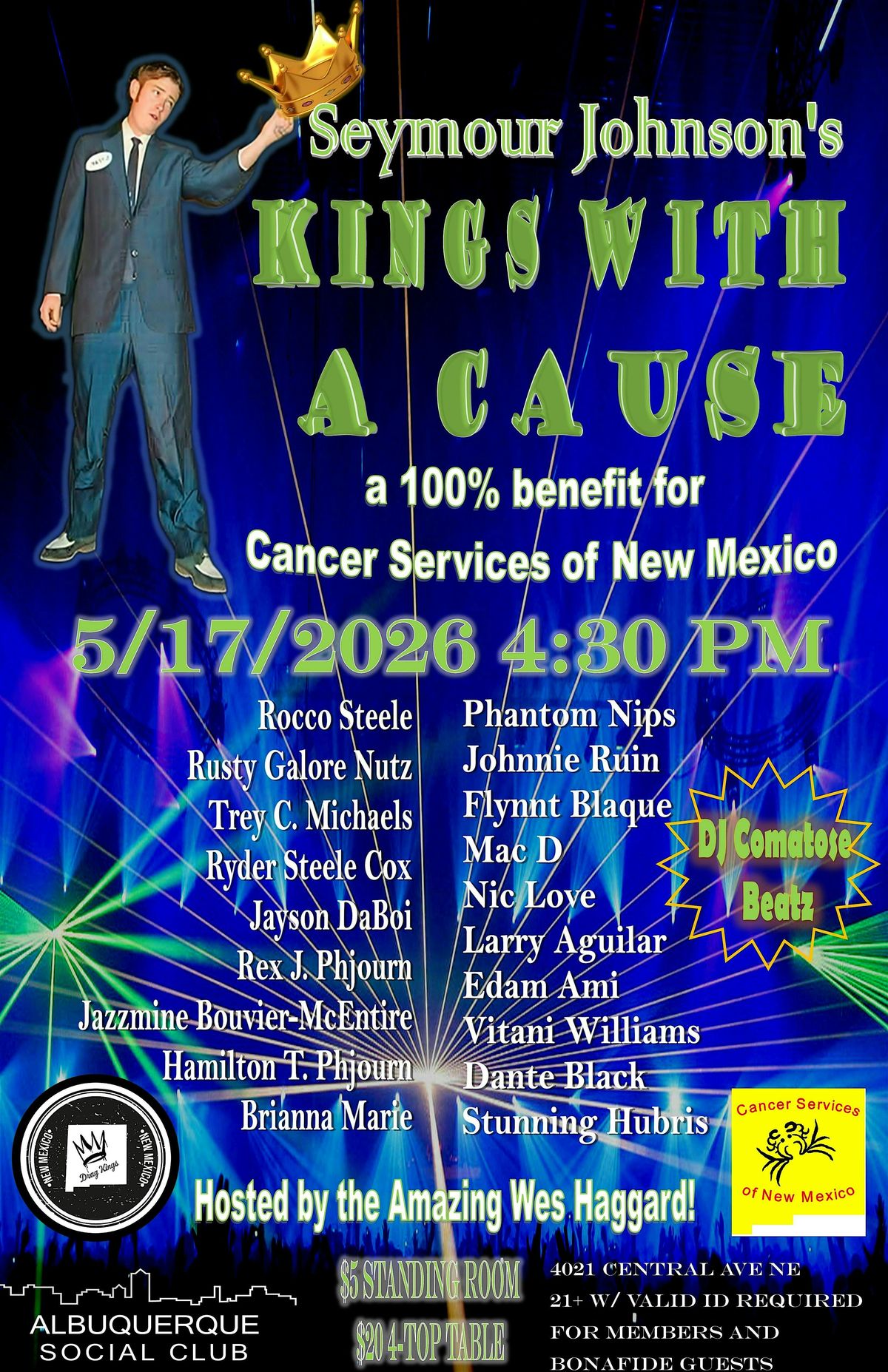 Join the MOST ICONIC Drag Kings of Albuquerque's Queer community in a benefit for Cancer Services of New Mexico and Seymour Johnson!