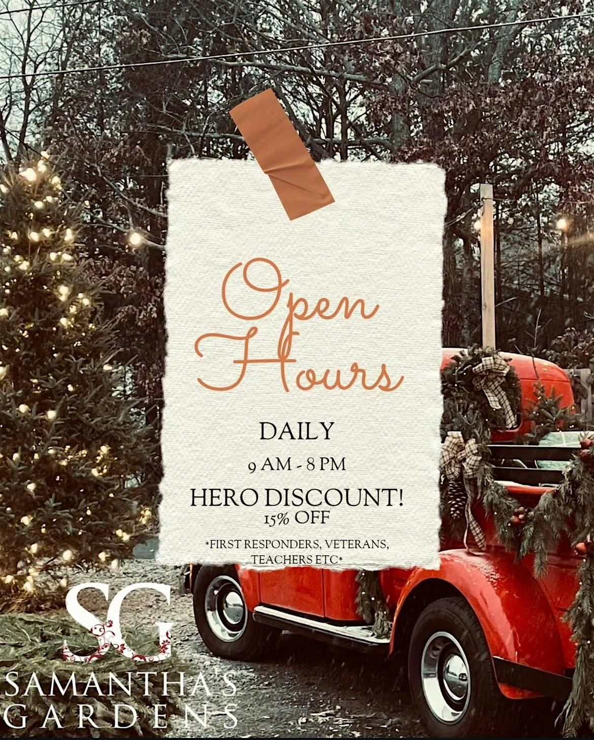 Come visit the Samantha’s Gardens Christmas Shoppe! We have Christmas Trees, Garland, custom wreaths and more.