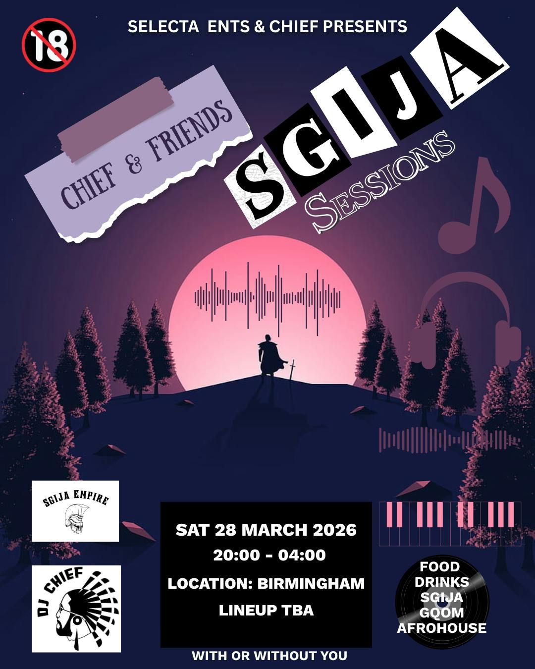 SELECTA ENTS x CHIEF PRESENTS: SGIJA SESSIONS A night where rhythm, culture, and energy collide. Chief & Friends link up with Selecta Ents to bring you a powerful SGIJA experience in Birmingham.🗓 Saturday 28 March 2026⏰ 20:00 – 04:00📍 Birmingham🎟 Tickets out: Wednesday 11 March 2026Expect a night filled with:🎧 SGIJA🌍 Afrohouse🍹 Drinks & Good Vibes🍔 Food AvailableLineup dropping soon… stay locked. 👀Pull up with or without your crew — the vibe will be undeniable.Disclaimer: