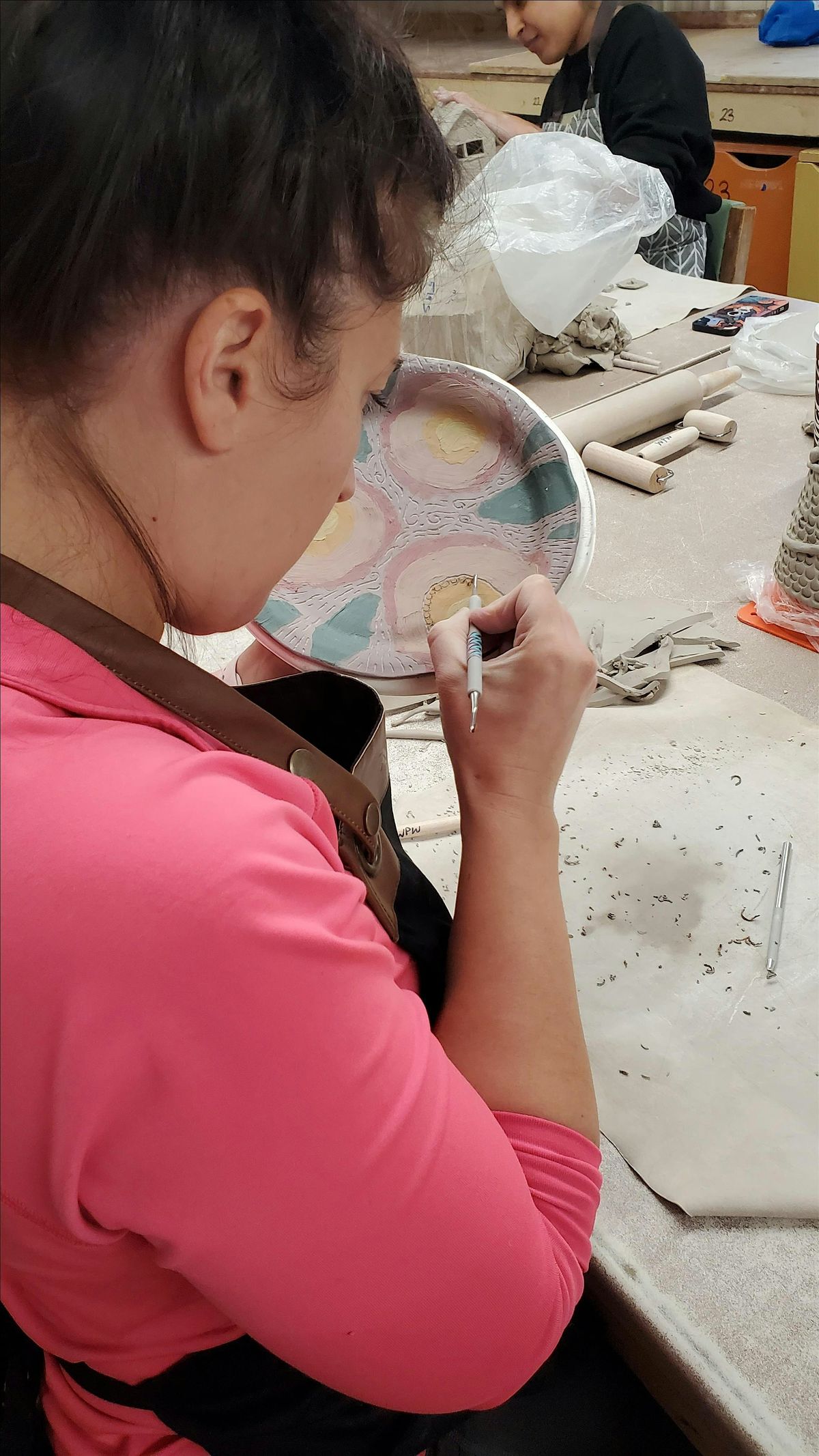 In this 2.5 hour workshop you will work on a leather hard stoneware plate with a selection of coloured slips. A design will be scratched on the surface, this is why we call it 'sgraffito' from the italian word for scratching. This workshop is suitable for beginners as it will be guided step-by-step. If you have experience with clay and want to learn more about working with coloured slips you could book a separate workshop for that by contacting the studio.