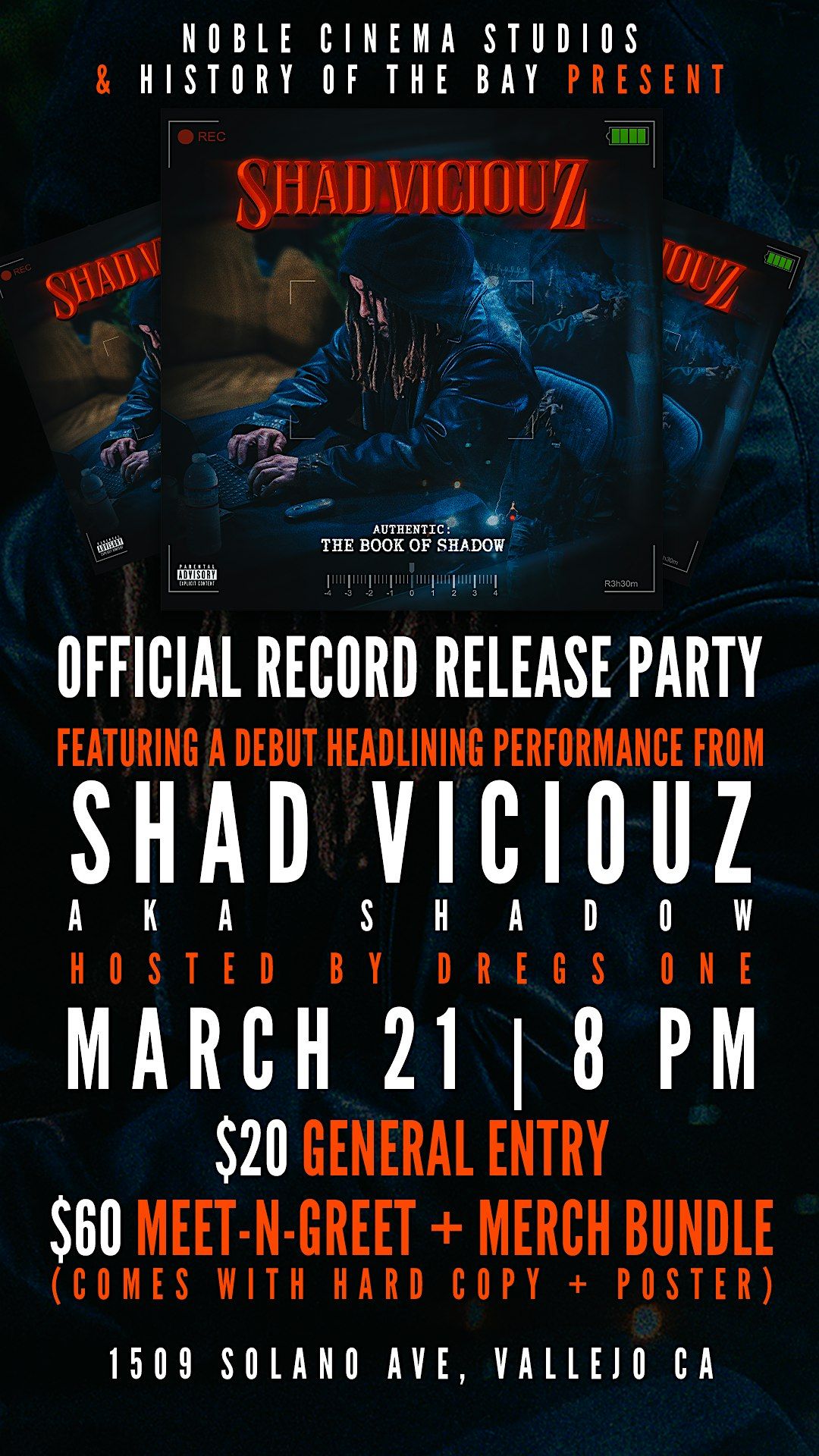 SHAD VICIOUZ has dropped his BRAND NEW album "AUTHENTIC: THE BOOK OF SHADOW" and will be HEADLINING his record release at NOBLE CINEMA STUDIOS, hosted by HISTORY OF THE BAY's own DREGS ONE!