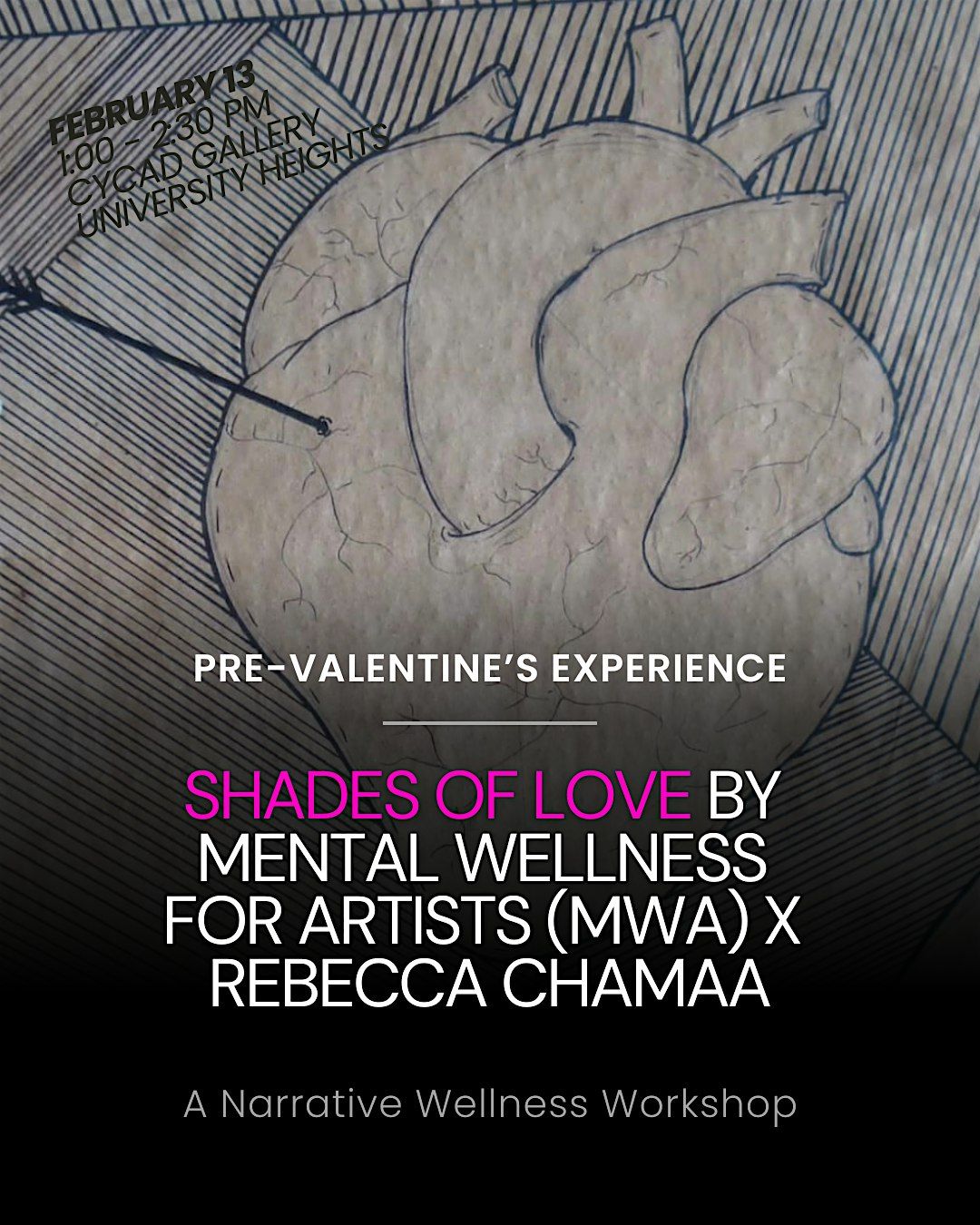 💖 This February 13, Mental Wellness for Artists (MWA) is hosting three distinct pre-Valentine’s workshops! Each workshop explores love from a different angle, stands on its own, and is co-hosted with a different community partner. Join one, or all three, depending on what resonates!