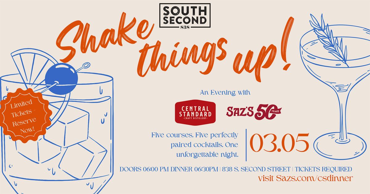 Join us for an exclusive 5-course meal prepared by Saz's Executive Culinary Team, perfectly paired with 5 incredible cocktails featuring spirits from Central Standard. Central Standard’s Jim Kanter will share the secrets behind each spirit, from the locally sourced ingredients to the distilling processes that define the Midwest standard. This is an opportunity to discover exquisite flavor profiles that redefine the boundaries of food and craft spirit pairing, all while celebrating Saz’s 50th Anniversary!