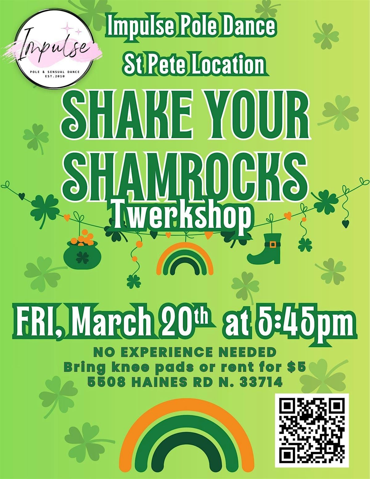 Come join us for a fun and exciting twerking workshop to celebrate St. Patrick's Day! Get ready to shake your shamrocks and learn some new moves. This in-person event will be held at 5508 Haines Rd N. St Pete, FL 33714. Bring your friends and get ready to twerk your charms off! Don't miss out on this festive and energetic workshop. See you there!