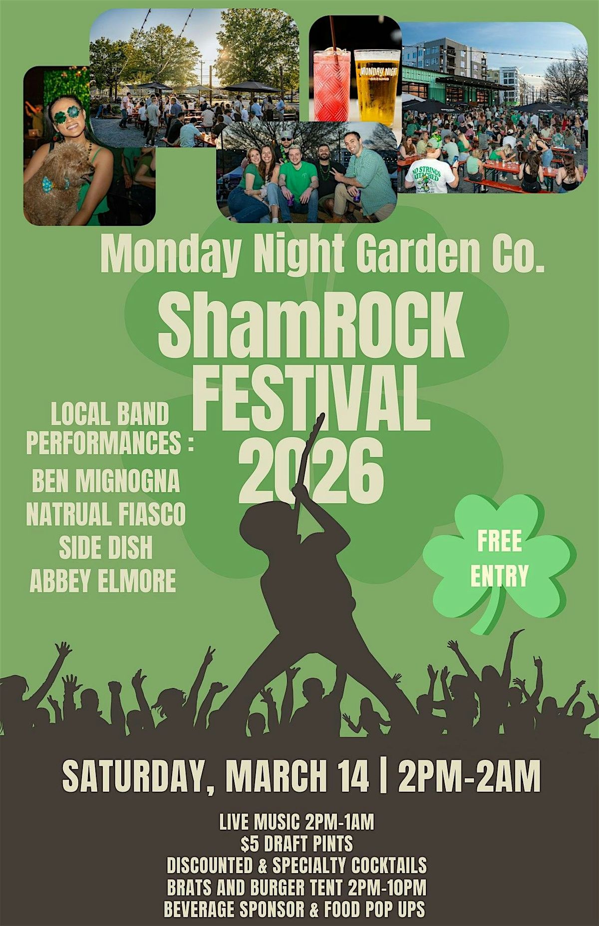 Get ready for the 3nd Annual ShamRock – a high-energy music festival showcasing incredible local talent, delicious food, and unbeatable drink specials. Join us for a day packed with live performances, mouthwatering eats, and festive vibes as we celebrate St. Patrick’s Day weekend the right way!