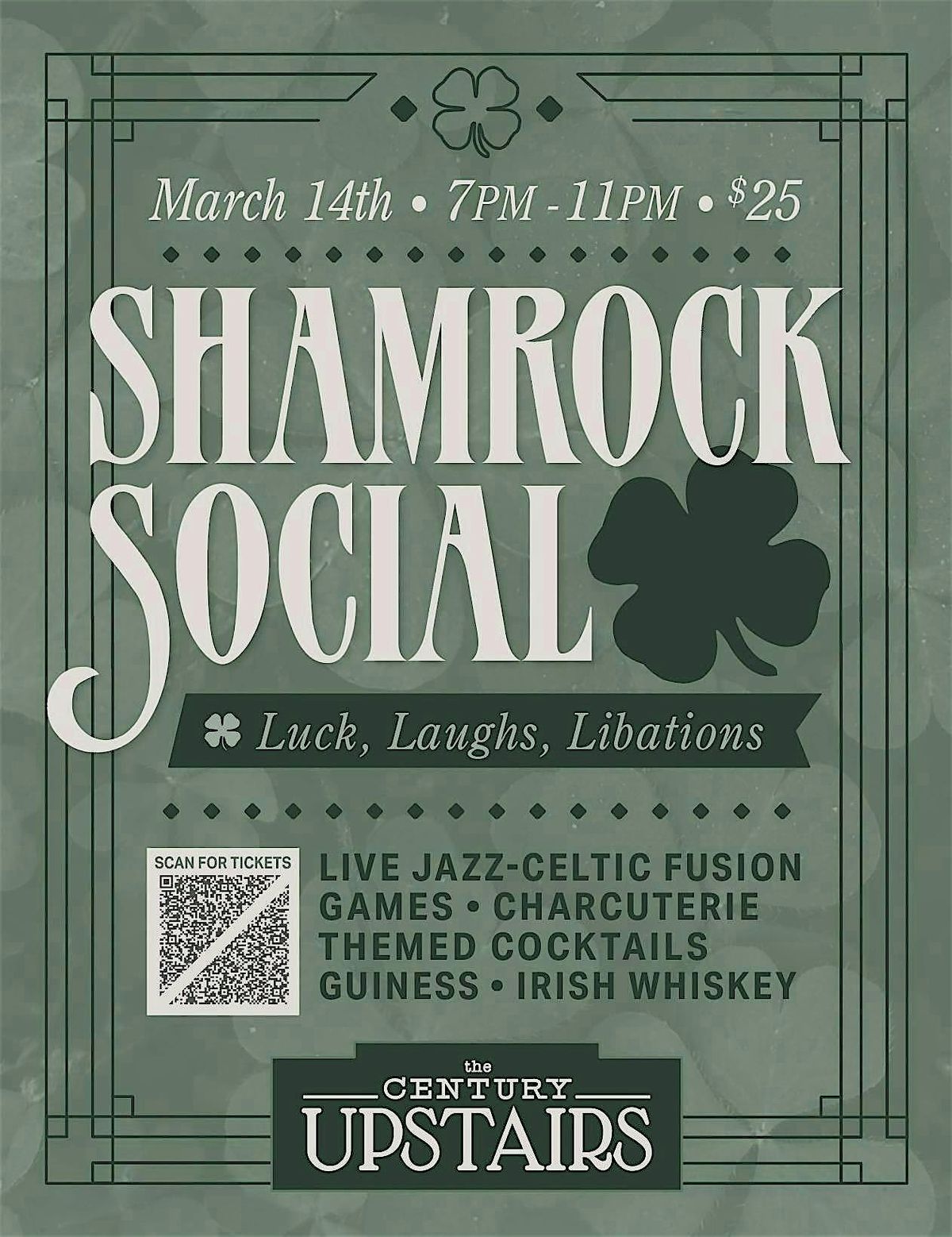 Get ready for a fun-filled in-person hangout at Century Bar Upstait's! It's the perfect chance to kick back, meet new friends, and celebrate with chill celctic jazzy tunes. Whether you're here for the laughs, chats, or just to soak up the atmosphere, this event's got you covered. Don’t miss out on a great time – come say hello and join the fun! One ticket includes entrance to upstairs, curated bites, and live jazz music!