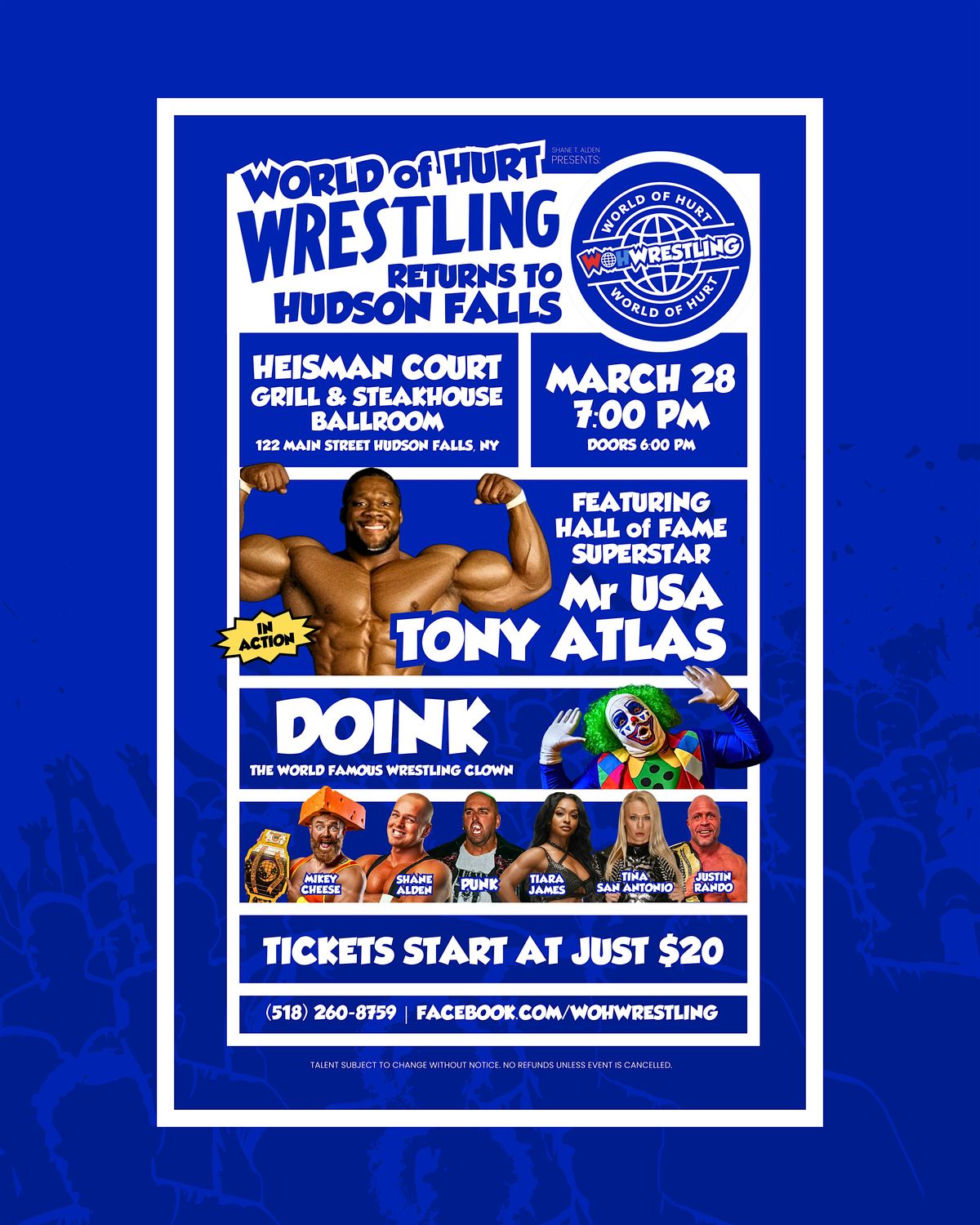 Shane T Alden presents WOH Wrestling returns to Hudson Falls, NY Saturday March 28th ! Featuring WWE legend Mr USA Tony Atlas, Doink & more