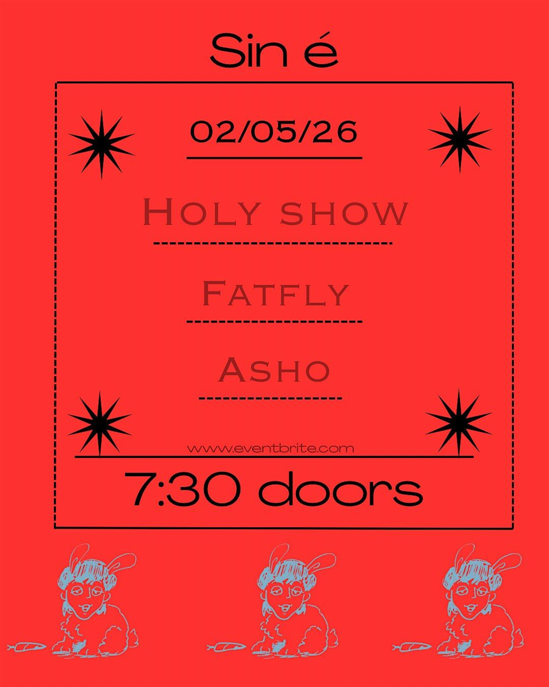 See 3 of Dublin's best up and coming bands. Holy Show, Fatfly and Asho take to the stage at Sin é on the May 2nd. Doors 7:30.