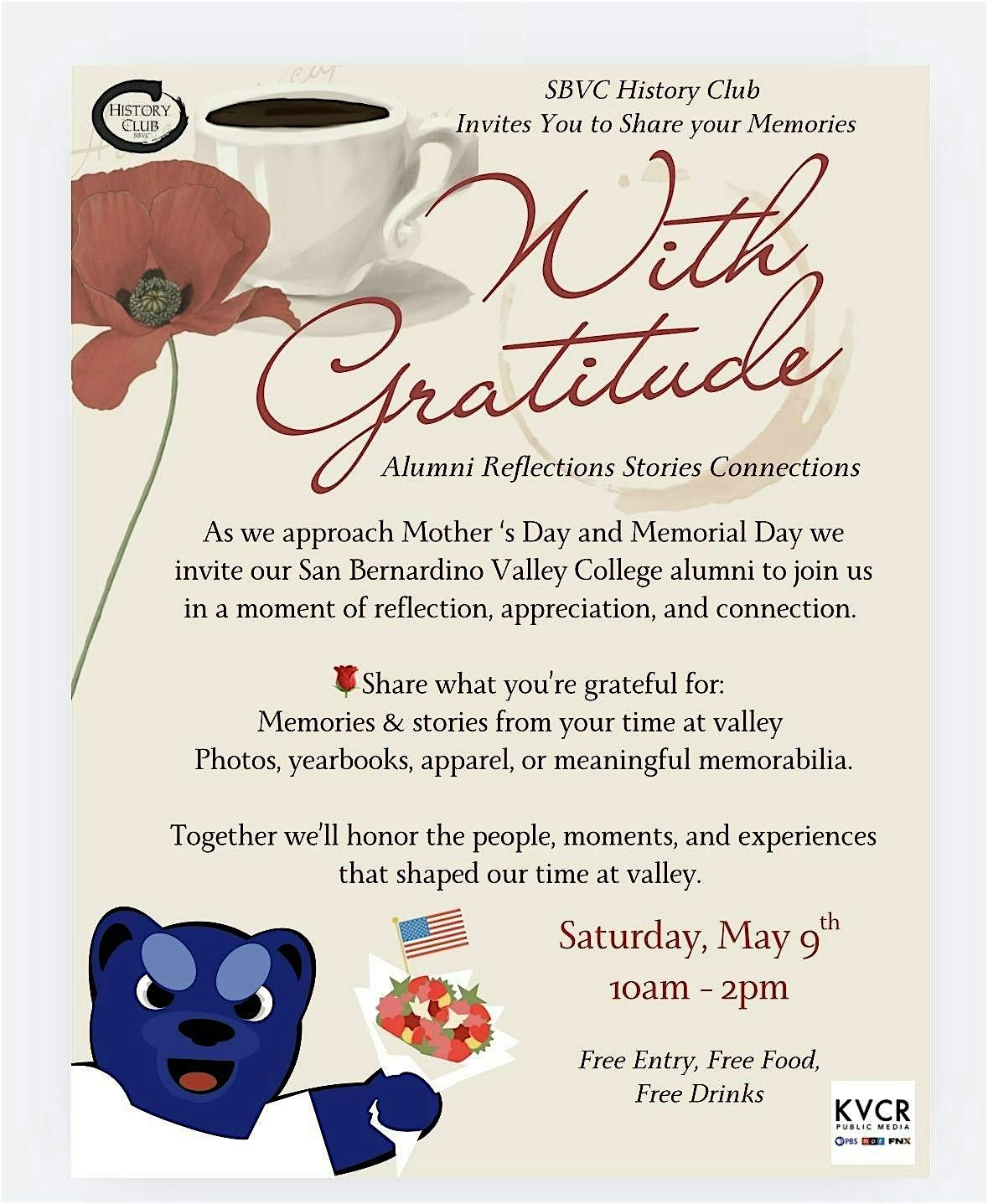 Welcome to Share Your Memories event! Join us at San Bernardino Valley College on March 9, 2026 at 10:00 AM (Pacific Time) in the Business Building Room 100 for a day filled with nostalgia and storytelling. Let's reminisce about the good old days, share our favorite memories, and create new ones together. Whether it's funny anecdotes or heartwarming tales, everyone has a story to tell. Don't miss out on this opportunity to connect with others and celebrate the power of storytelling. See you there!