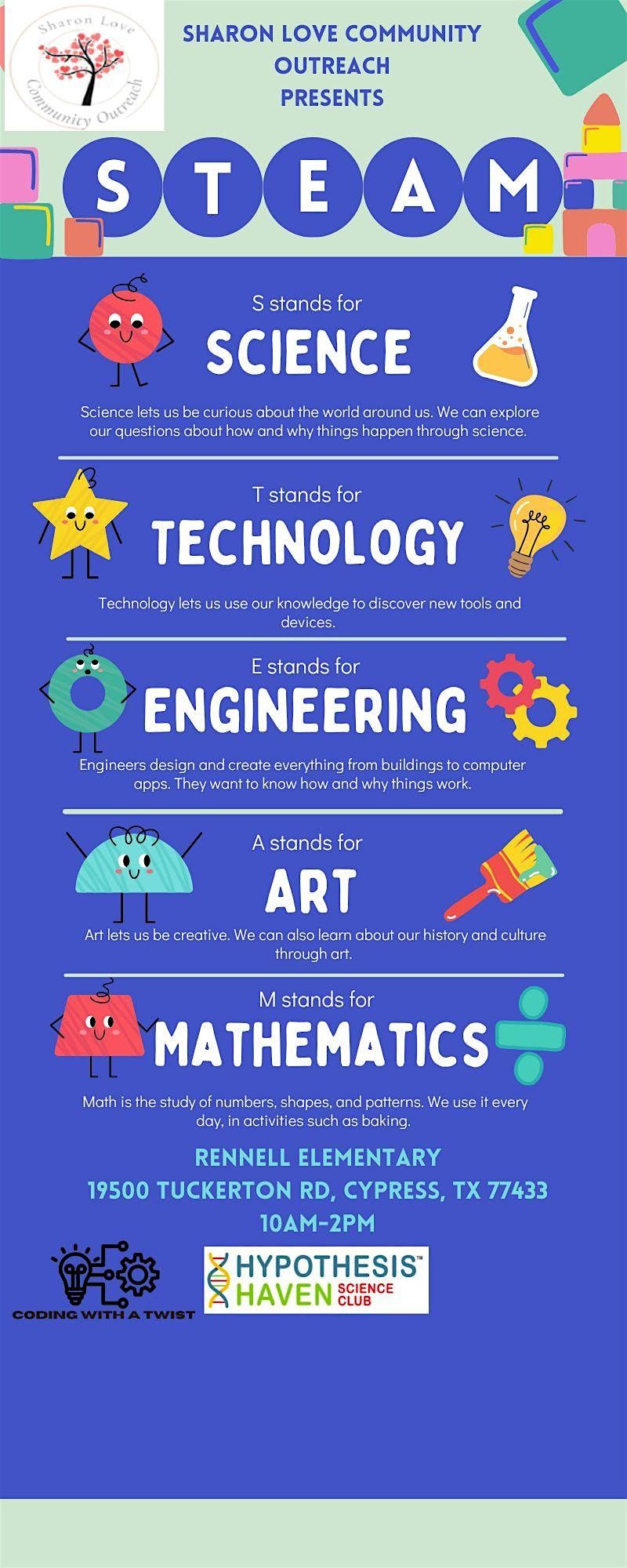 The Sharon Love Community Outreach Spring 2026 STEAM Symposium is designed to bring together students, educators, and community partners a hands-on learning experience that connects science, technology, engineering, arts, and math (STEAM) in an engaging and practical way. Our goal is to inspire students to see STEAM beyond textbooks—connecting education to real-world impact, innovation, and opportunity. The event will feature exhibitors, speaker presentations, and panel Q&A sessions, with a focus on engaging both students and their families through interactive programming.