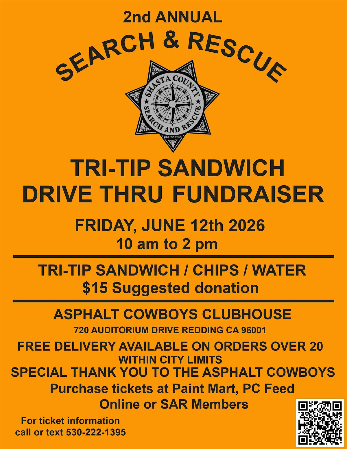 Drive through and grab lunch for a tasty cause! The Shasta County Search and Rescue Tri Tip Sandwich Fundraiser is a great way to support our local heroes while enjoying some delicious eats. Bring your friends and family, satisfy your hunger, and help out a fantastic team doing important work in the community. Don’t miss this fun, casual event – your appetite and support make a difference!