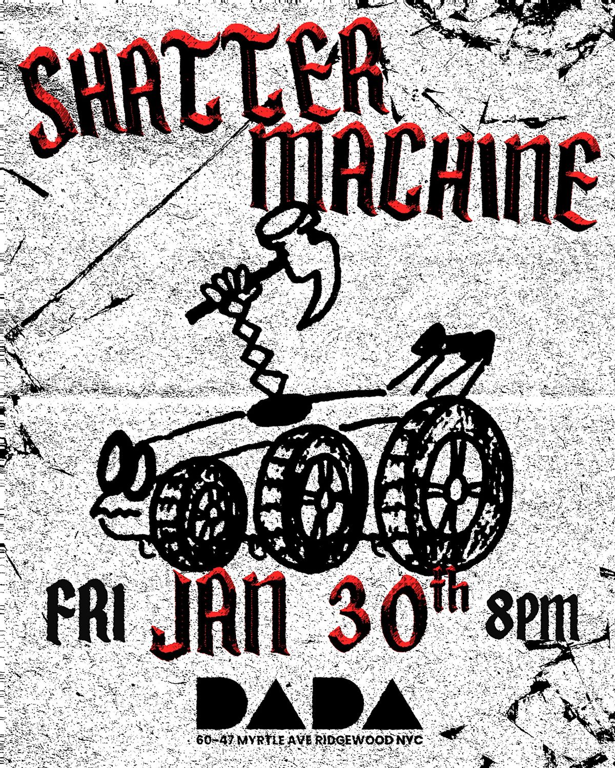 Shatter Machine is a project of compositions by Queens-based guitarist, Sean Saville. It is music inspired by core memories of growing up in upstate New York— frigid cold winters, monster truck rallies, DIY shows, cartoon re-runs, and futile attempts at ‘don’t try this at home’ makeshift chaos.