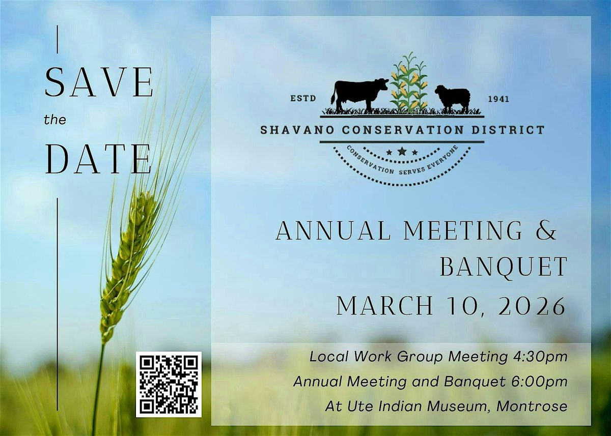 Welcome to the Shavano Conservation District Annual Meeting and Banquet. Join us at the Ute Indian Museum on Tuesday, March 10 at 6:00pm for an evening focused on the people and operations that keep our agricultural lands productive and our natural resources strong. Visit with fellow farmers, ranchers, and land managers, hear updates on District programs and local conservation projects, and enjoy a hearty meal. This in-person gathering is a chance to connect, share ideas, and support practical conservation efforts that benefit working lands across the district. We hope to see you there.