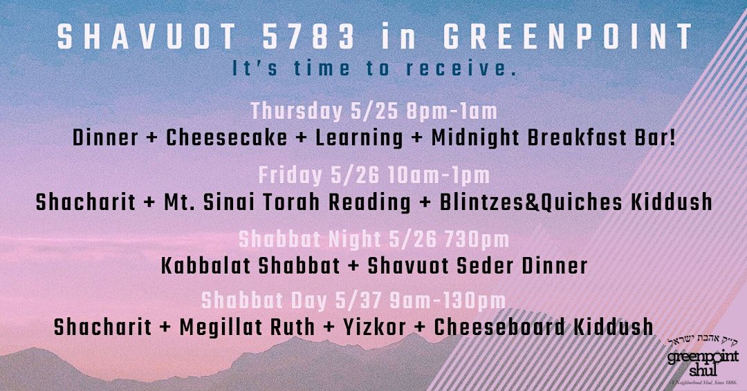 Join us for a delicious, interactive, and Torah-filled Shavuot 2023 ... with Dinner+Cheesecake+Learning on Thursday night, our annual "Shavuos Seder" on Friday night, and two days of Services, Ruth, Yizkor, and Kiddush!