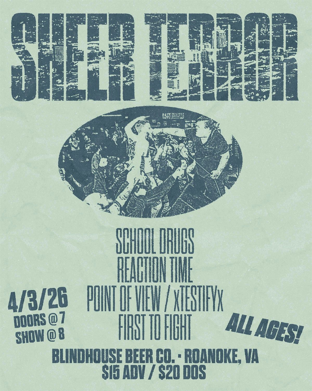 NYHC veterans Sheer Terror playing Roanoke with School Drugs, Reaction Time, Point of View/xTestifyx (split set), and First to Fight