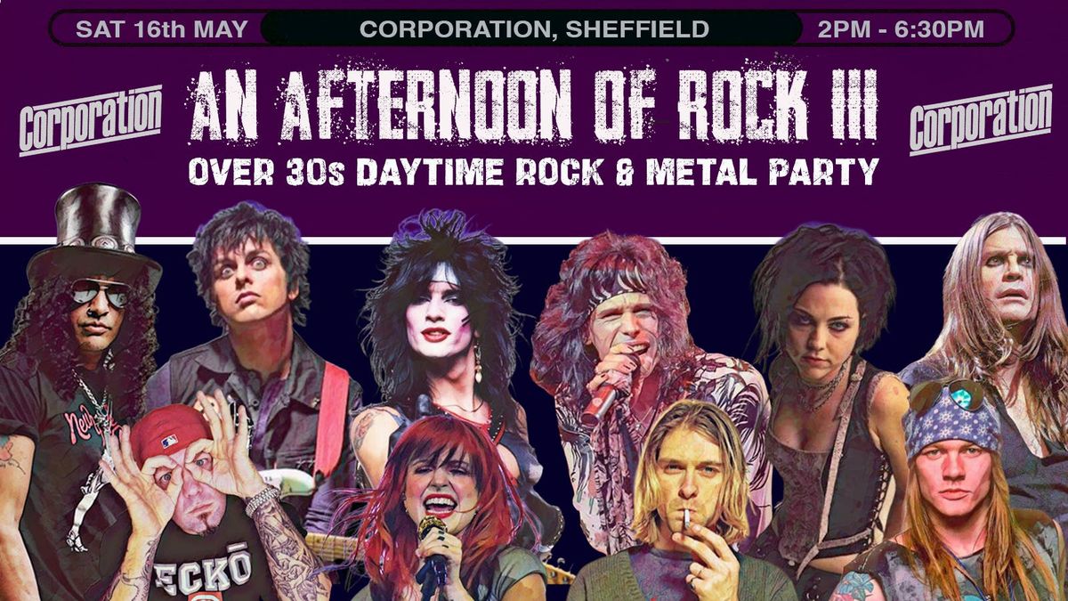 After two previously sold out events in Sheffield, An Afternoon of ROCK is coming back to Corporation for another daytime rock and metal party for all you over 30s rockersJoin is again for a mix of well known rock, hair metal, pop-punk, grunge and nu-metal hits from across the decades.
