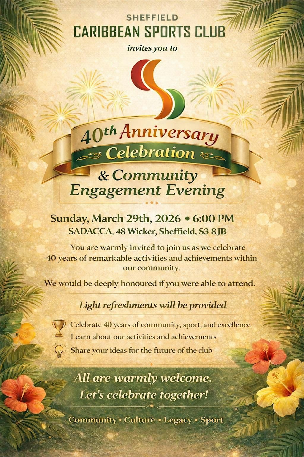 Join us in person to celebrate four decades of community, culture, and sport at the Sheffield Caribbean Sports Club! It's going to be a fantastic time filled with fun, laughter, and memories. Come connect, cheer, and be part of something special as we honor 40 amazing years together. Don’t miss out on this epic celebration!