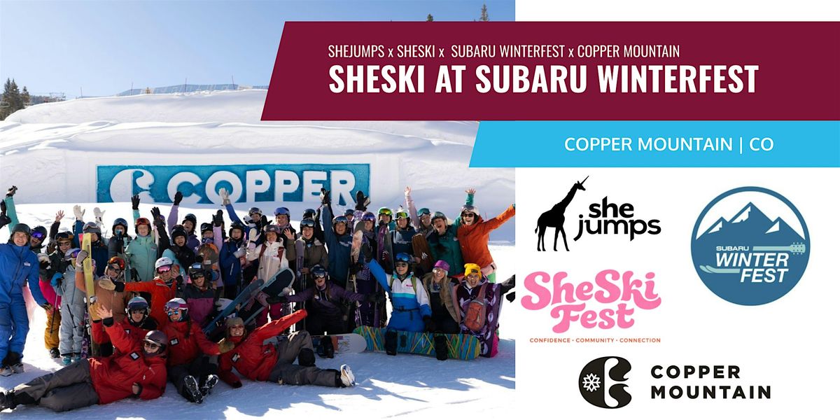 SheJumps presents SheSki Fest at Subaru Winterfest! Join us on February 21, 2026 at Copper Mountain Resort for a women’s ski meetup, bringing together participants of all ages and skill levels for a day of skiing, learning, community, and fun!