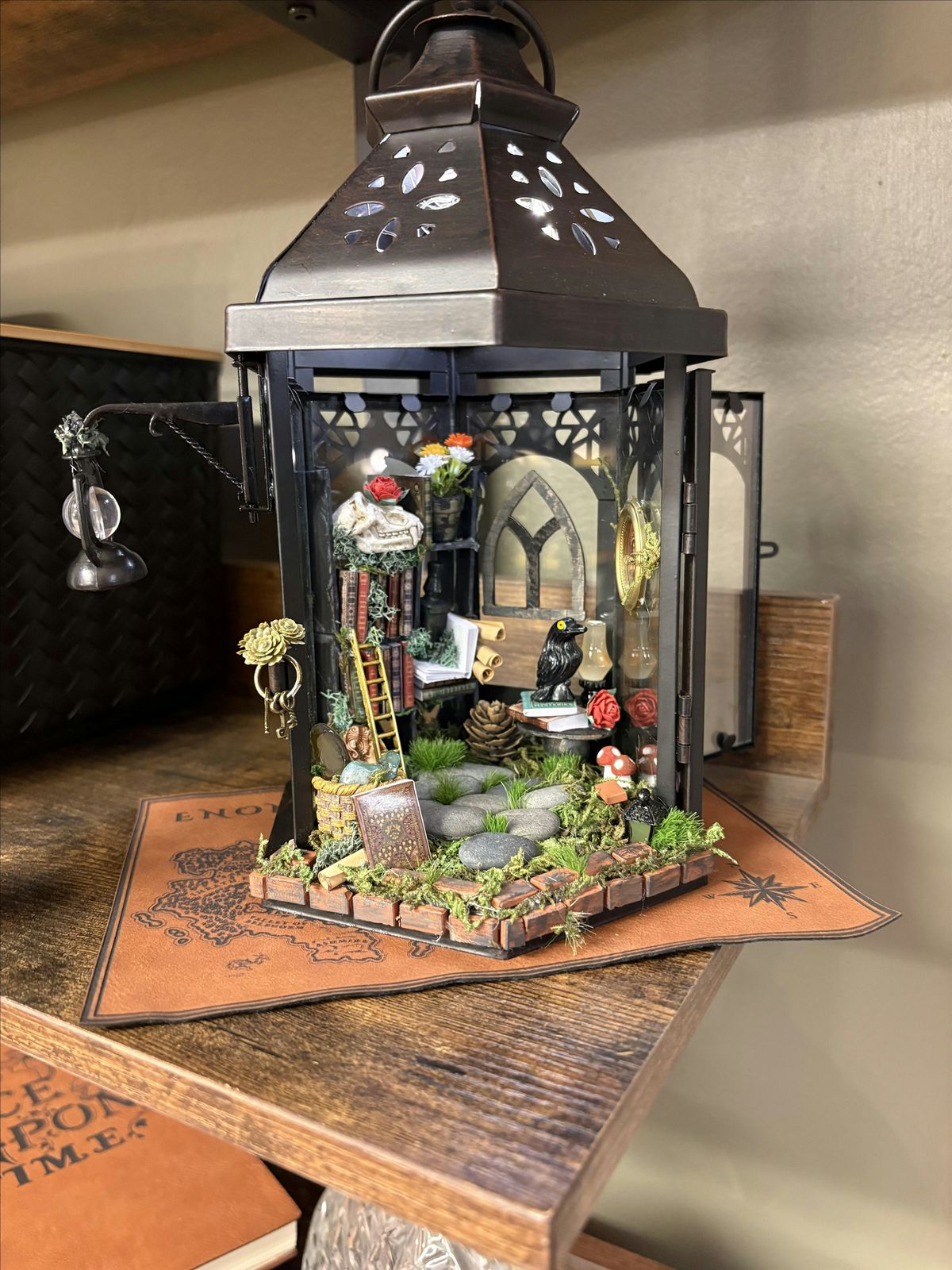This DIY Sherlock Holmes-themed book nook is a fun project for anyone who loves mystery and creativity. The scene features a small, cozy space with a collection of books, a tiny wooden ladder, and cute details like mushrooms, flowers, and moss. There’s a crow figurine perched on a stack of books, adding to the mysterious vibe.