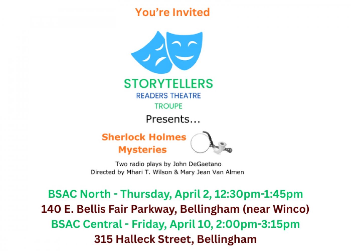 Two Sherlock Holmes Mysteries. It’s a fundraiser with donations collected at performances: 50% to BSAC & 50% to Storytellers.
