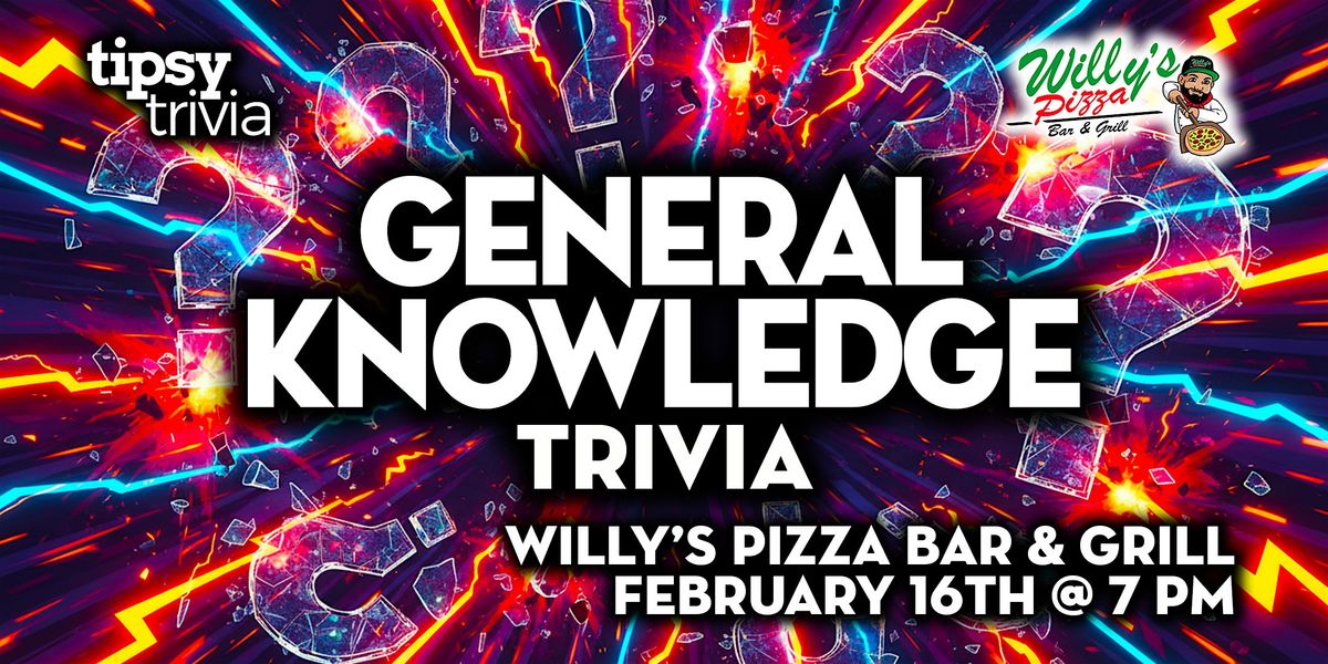 Tipsy Triviaβs General Knowledge showdown at Willy's Pizza Bar & Grill covers everything from pop culture and music to sports, history, and current events, all scored live on your phone with a leaderboard that keeps everyone locked in.
