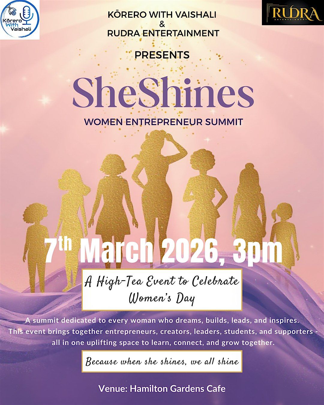 Join us at Hamilton Gardens Café on 7 March 2026 at 3:00 PM for an uplifting afternoon created to celebrate, empower, and inspire women. Set in a beautiful lakeside garden café, SheShines brings together 4+ accomplished women speakers from diverse backgrounds who will share their journeys, insights, and lessons on career growth, entrepreneurship, and personal development.