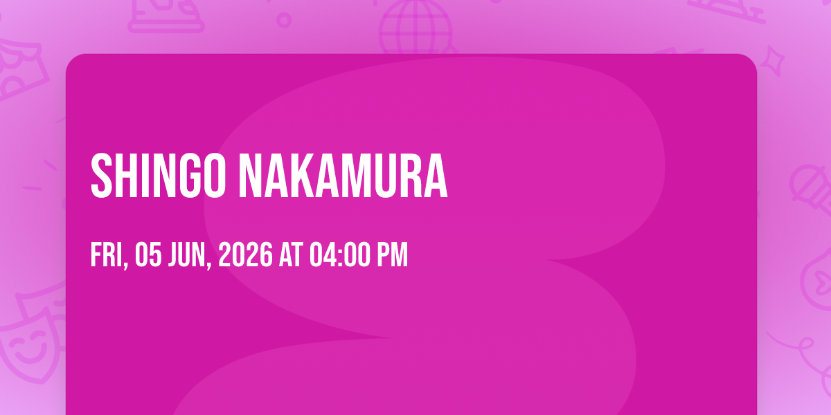 🎉 Prepare to be amazed at Shingo Nakamura, the most anticipated gathering of the season! 🌟 Set against the stunning backdrop of Celebrities Nightclub in vibrant Vancouver, BC, this event promises to redefine your expectations. 📅 Mark your calendars for June 5th, 2026 at 04:00 PM and get ready to immerse yourself in an atmosphere of wonder and excitement. ✨ From the moment you arrive, you'll be transported into a world where memories are made and stories come alive. They have crafted an experience that perfectly harmonizes entertainment, innovation, and community spirit. 🌈 Join us as we create moments that will be discussed for years!http://maps.seatics.com/GeneralAdmissionEvent_2019-01-14_1230_SVGC_tn.gif