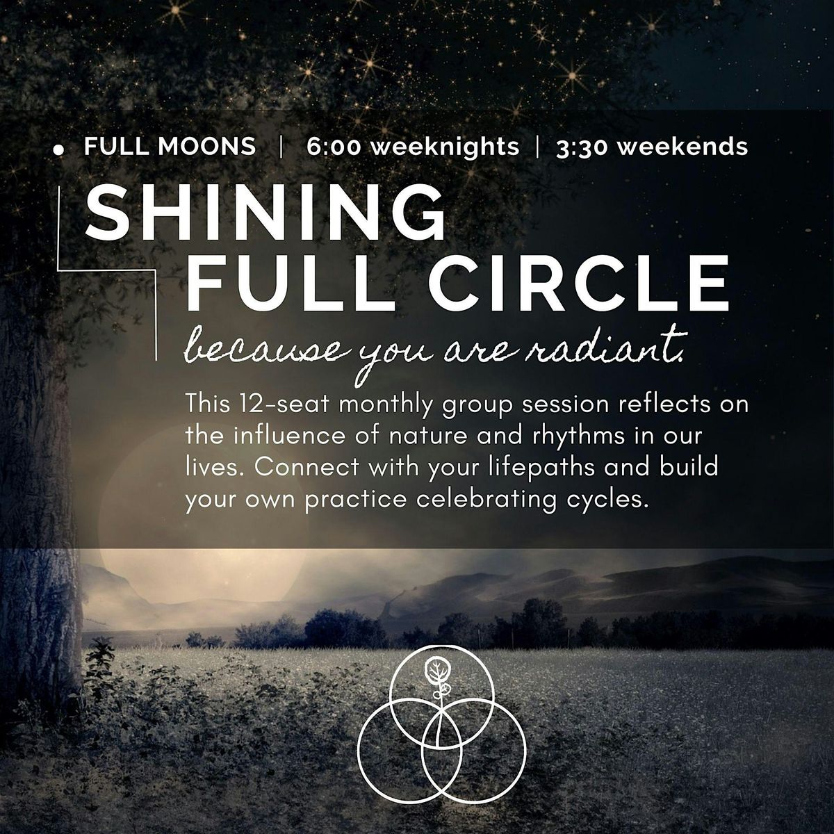 12 spots are available at this full-moon session, where we'll ceremoniously reflect on lessons learned, and consider our personal path since the last full moon, all framed within the concept of nature's cradle.