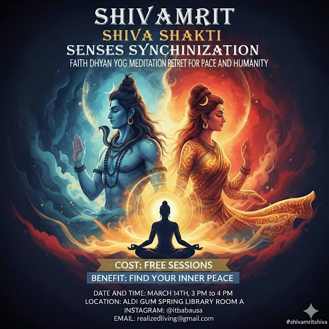 Shivamrit Shiva Shakti Senses Synchronization Faith Dhyan Yog Meditation retreat for peace and humanity Cost: free sessions.