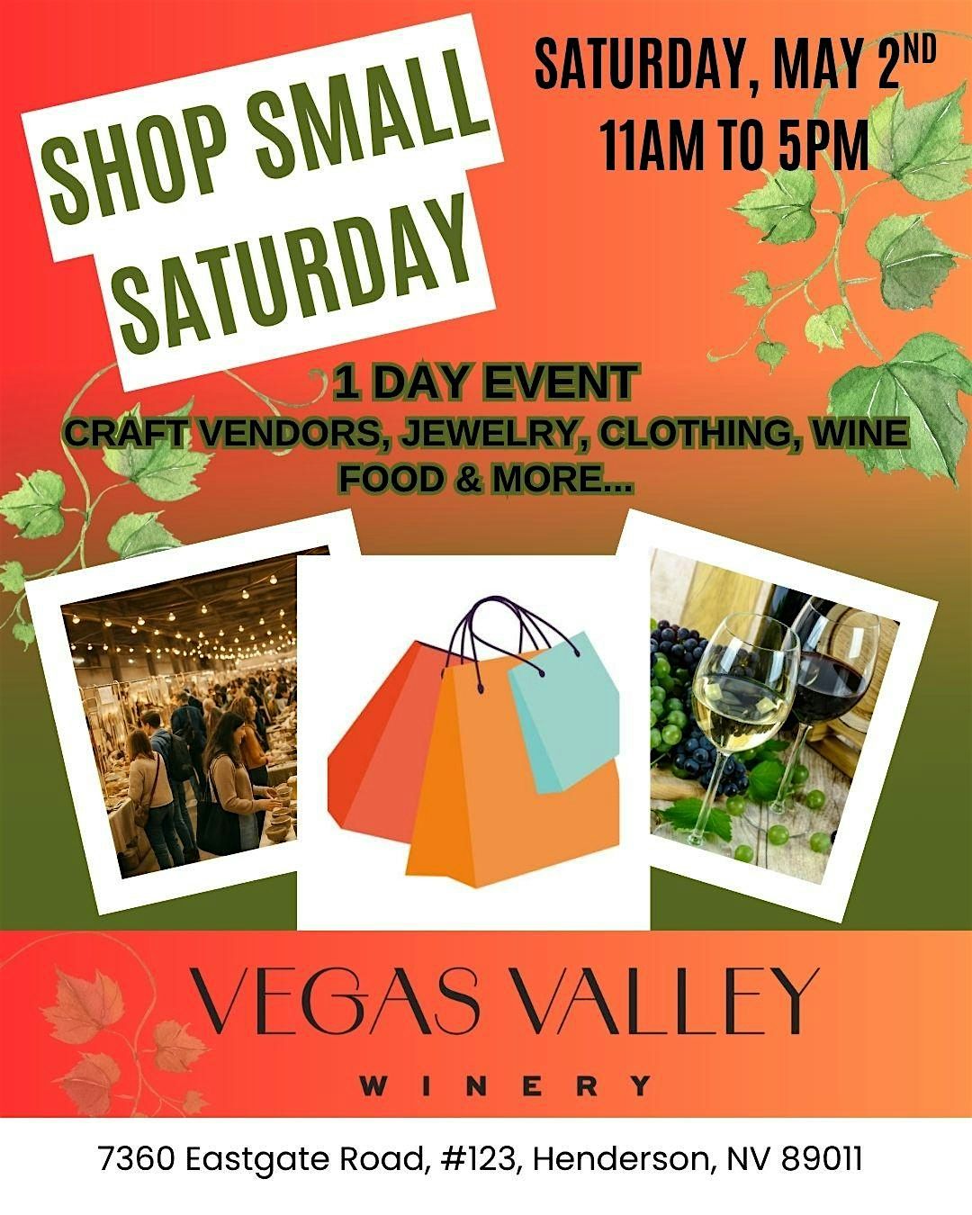 Join us at Vegas Valley Winery for Shop Small Saturday, a one-day shopping event celebrating local makers and small businesses. From 11 AM to 5 PM on Saturday, May 2nd, the winery will transform into a lively marketplace featuring a variety of craft vendors, jewelry, clothing, specialty goods, and more.