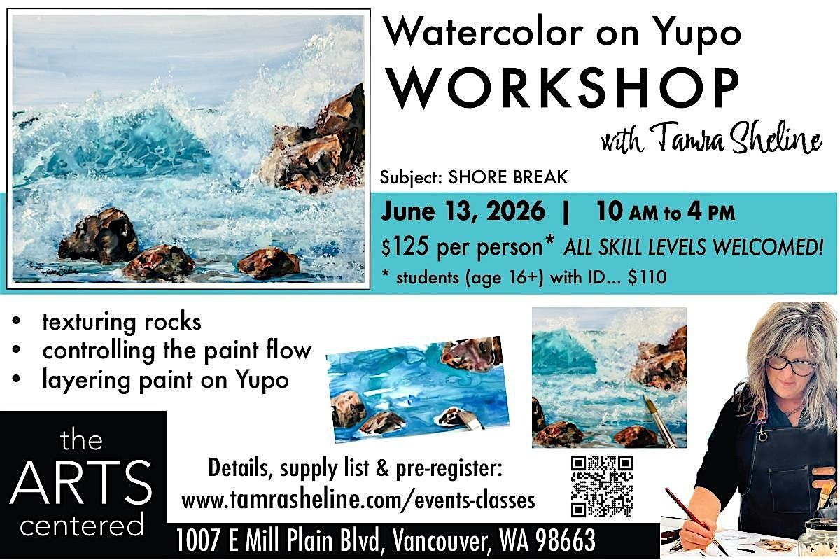 Join us at theARTScentered on June 13, 2026 at 10:00 AM (PDT) for a fun and relaxed watercolor workshop using Yupo paper. Whether you're new to watercolor or just want to try something different, this hands-on session will help you explore vibrant techniques inspired by the shore break. Bring your creativity and get ready to make some cool art in a friendly, laid-back atmosphere. See you there!