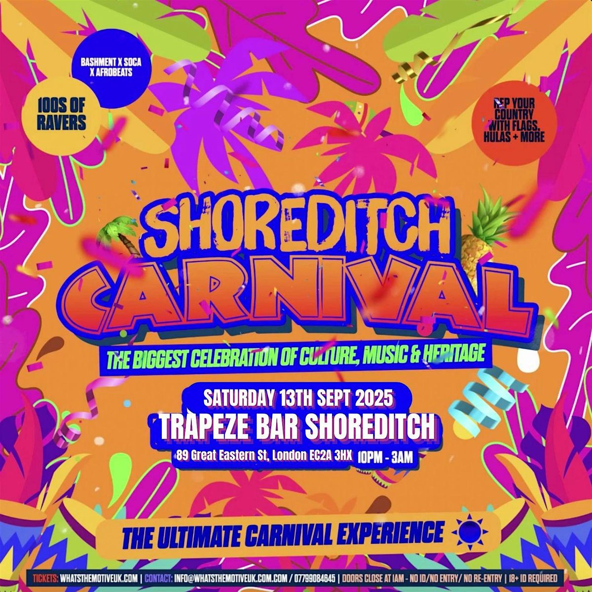 Get ready and join 100s of people for SHOREDITCH CARNIVAL, the CRAZIEST Party of 2025 with all your favourite DJs playing the best in Bashment, Soca & Afrobeats all This will be a SOLD out experience like none-other as we prepare the WILDEST Club Night in the heart of Shoreditch.