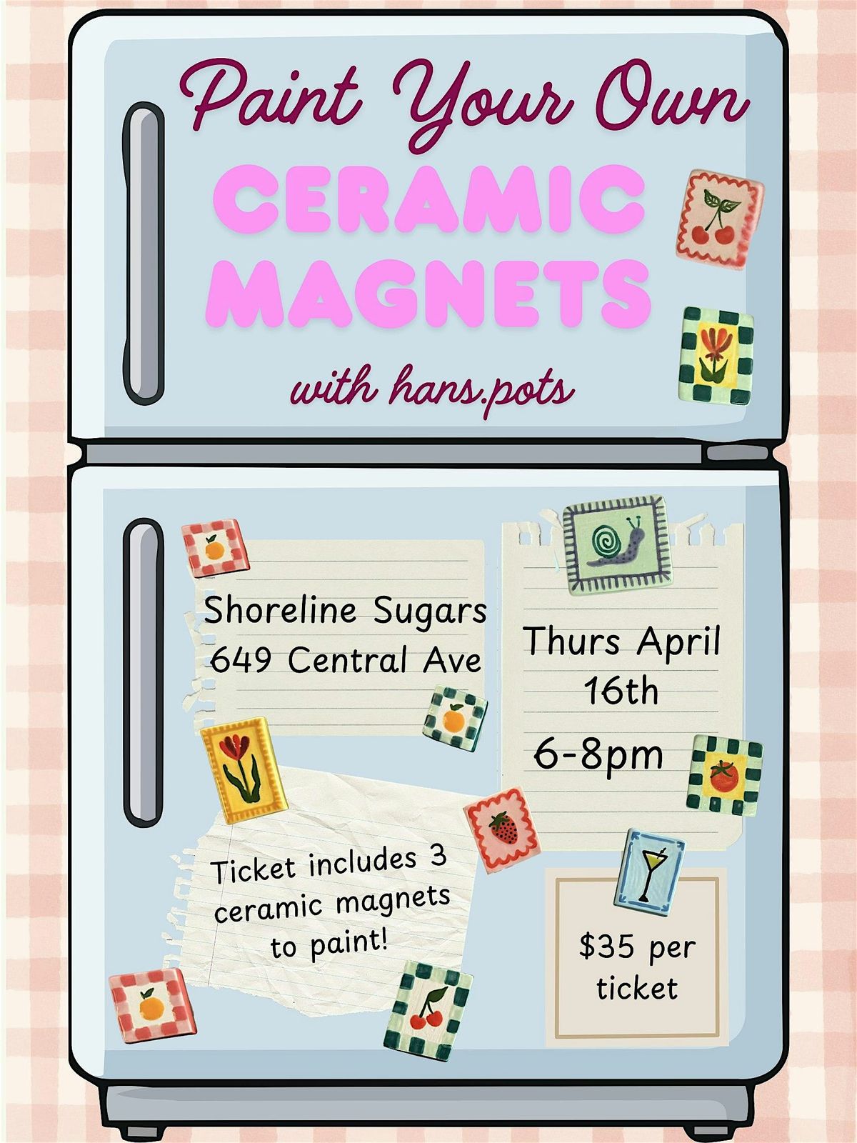 Join us for a fun and cozy workshop painting your own handmade ceramic magnets, guided by Hannah Lawson from Hans.Pots! Bring your creativity, shop around Shoreline Sugars, and make new friends while creating a unique piece to brighten your space. You will learn application techniques and hand-paint 3 magnets with real ceramic glazes. Hannah will take your piece to be fired in the kiln and they will be ready for pickup in about a week. Open to all skill levels, no experience needed :)