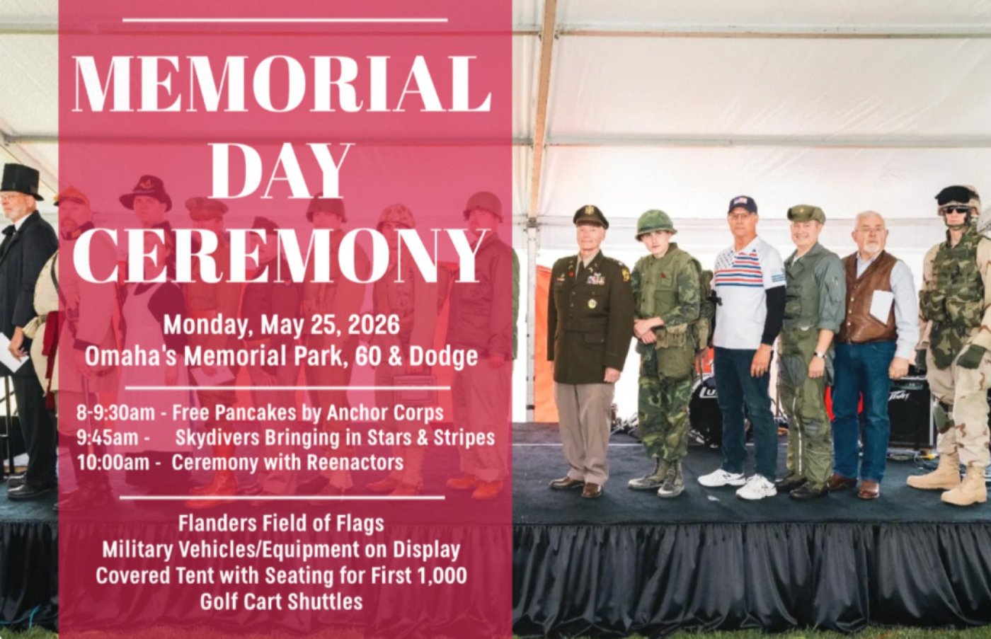The annual ceremony will be held at the lower part of the park near Dodge Street with seating for 1,000 under a covered tent and will include reenactors from various wars to honor our fallen. Volunteers driving golf carts will be happy to shuttle people to and from the ceremony site.