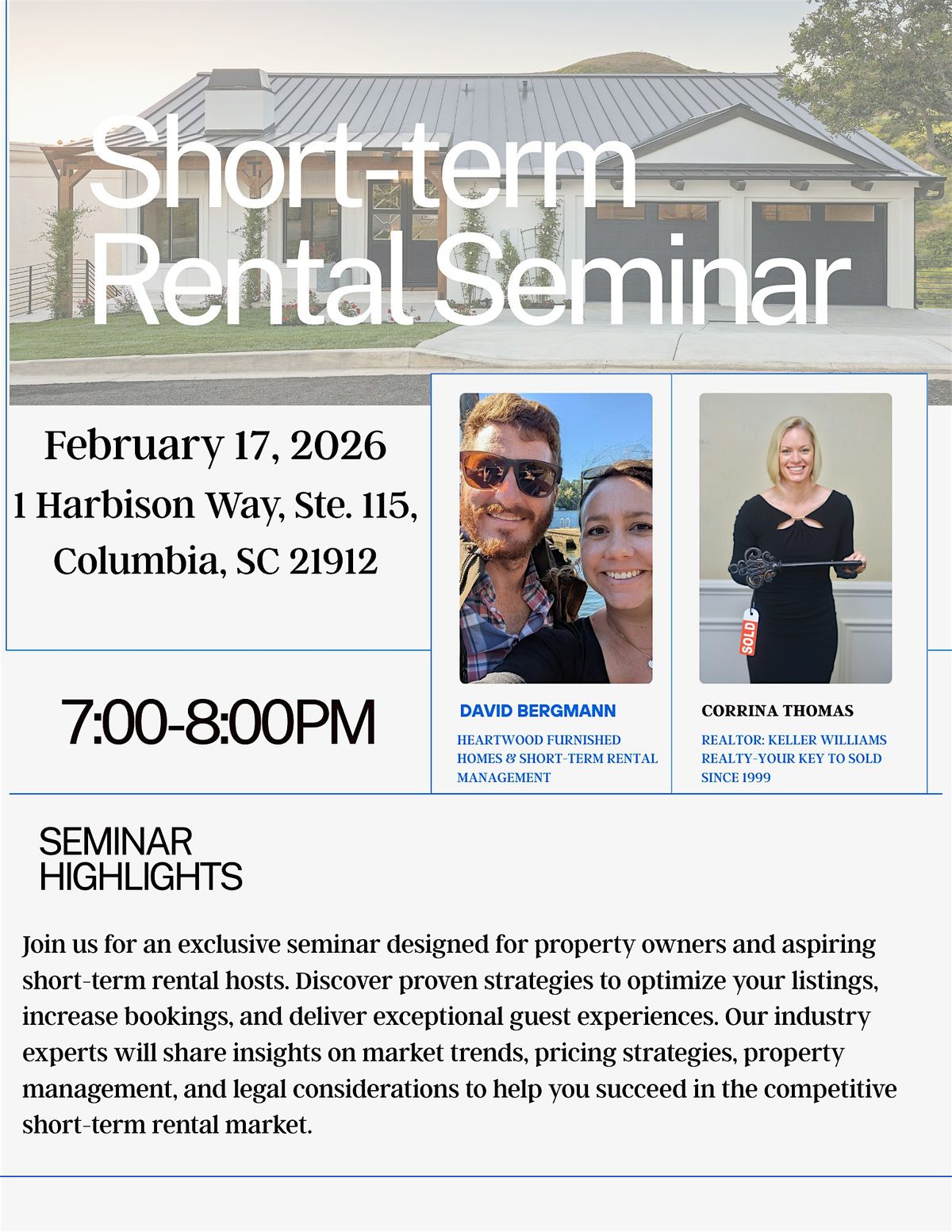 Join us for an exclusive seminar designed for property owners and aspiring short-term rental hosts. Discover proven strategies to optimize your listings, increase bookings, and deliver exceptional guest experiences. Our industry experts will share insights on market trends, pricing strategies, property management, and legal considerations to help you succeed in the competitive short-term rental market.