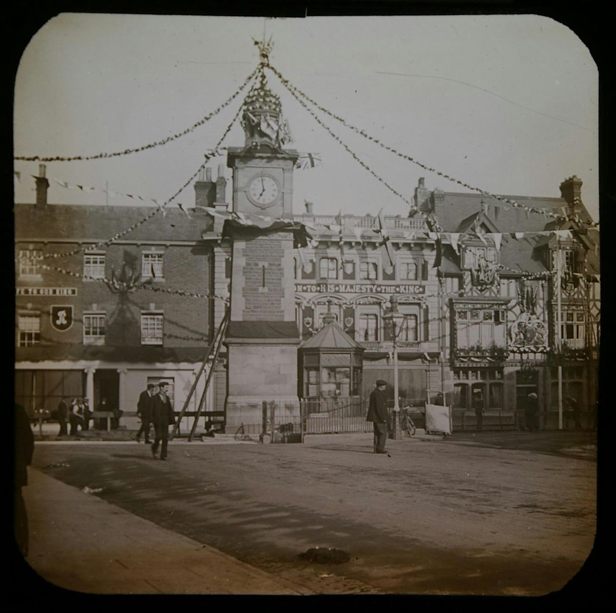PH0827/4/20: Lantern Slide of Market Place , Rugby, during visit of Edw VII, 1909