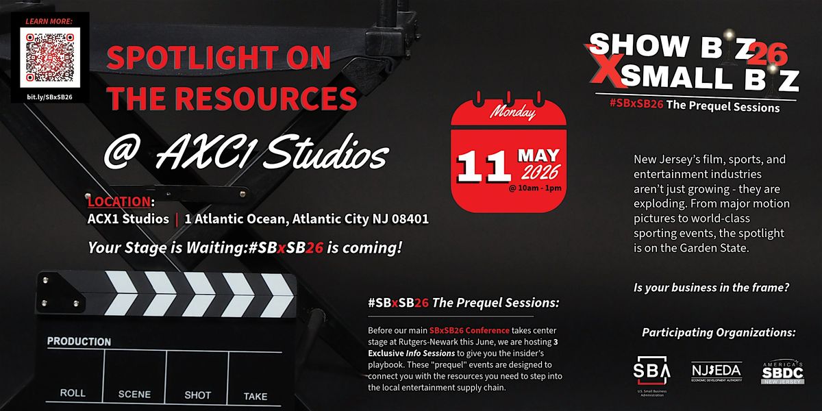 Join the SBA NJ District Office, NJSBDC at Brookdale Community College, the NJEDA, NJBAC and other business development organizations for the final SBxSB26 Prequel before the June conference. This isn't a lecture; it's a briefing on how to integrate your "Small Biz" into the multi-billion dollar "Show Biz" engine driving Atlantic City’s revitalization right on the pier at ACX1 Studios.