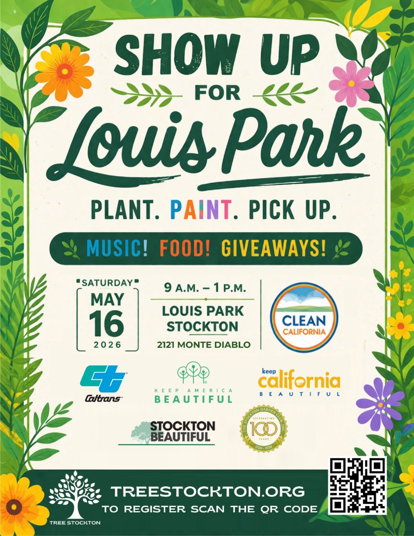 Help transform Louis Park with Tree Stockton and Clean California and partners, Saturday, May 16, 2026 from 9 a.m. to 1 p.m.! Activities include trash pickup, tree planting, painting, planting native species, and removing invasive species. Wear closed shoes, bring gloves and sunscreen/hat. We are community building, so pull up! Bring yourself or bring a group out to make our air and water cleaner and Louis Park a more welcoming place. If you have kids, make sure to check out free admission at Pixie Woods for Children and Families Day after lunch. Younger children welcome to participate with parent. It's going to be fun! There will be food, music and giveaways! Register to come out for breakfast, activities and a pizza celebration at noon.