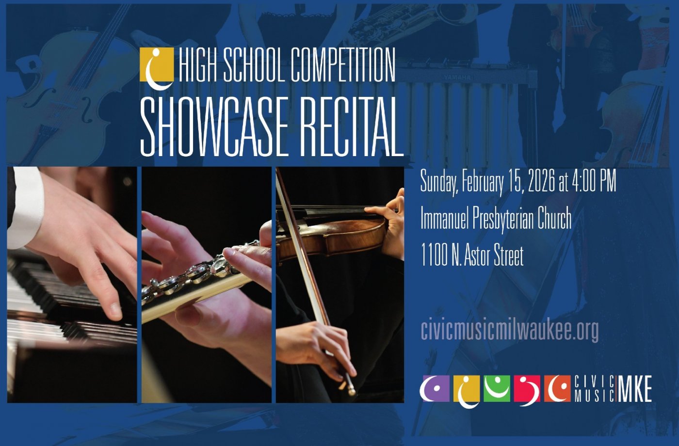 The CIVIC MUSIC MKE Showcase Recital is an earned performance by young musicians auditioning for the CIVIC MUSIC MKE High School Competition. This is a prestigious competition open to vocal and instrumental, classical and jazz musicians in grades 10-12. The top 11 competitors are awarded the opportunity to perform in this Showcase Recital. In addition, the competition judges are asked to select 2-4 scholarship winners who divide $1,500. The announcement of these scholarships is made at the close of the recital. This recital is free and open to the public.