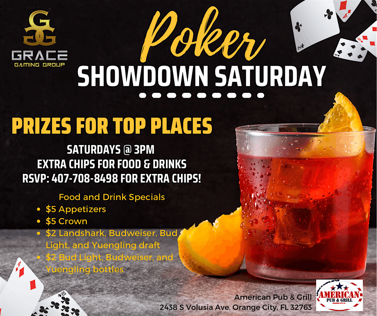 Welcome to the Showdown Saturdays Poker Tournament happening at American Pub & Grill on October 11, 2025 at 3:00 PM (Eastern Time)! Get ready for a day filled with excitement, strategy, and of course, some friendly competition. Whether you're a seasoned pro or a newbie to the game, this event is perfect for all levels of players.