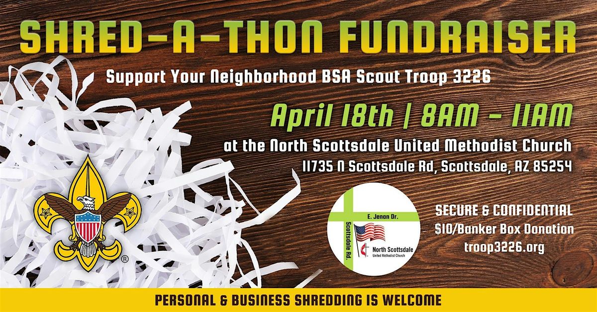 Need 👉 DOCUMENT SHREDDING 👈 -- Quick & Secure? 📣 BSA Troop 3226 would love to help you at our Annual Shred-a-Thon Fundraiser on Saturday, April 18th, from 8am-11am at the North Scottsdale United Methodist Church, 11735 N. Scottsdale Rd., Scottsdale, AZ 85254 (SE Corner of E Jenna Dr. & Scottsdale Rd.). Please come out and support YOUR local Scout Troop. Both personal document shredding and business document shredding welcome!