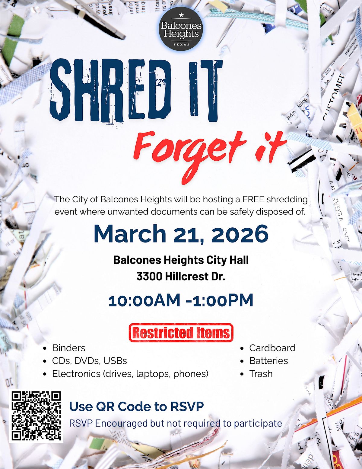 Safely shred your unwanted documents at the Balcones Heights City Hall