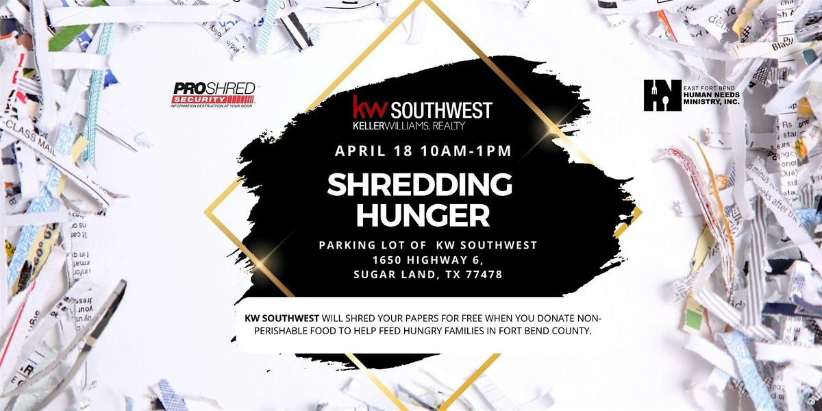 KW Southwest will shred your papers for FREE when you donate cash or non-perishable food to help feed hungry families in Fort Bend County. All donations will go directly to East Fort Bend Human Needs Ministry, Inc.