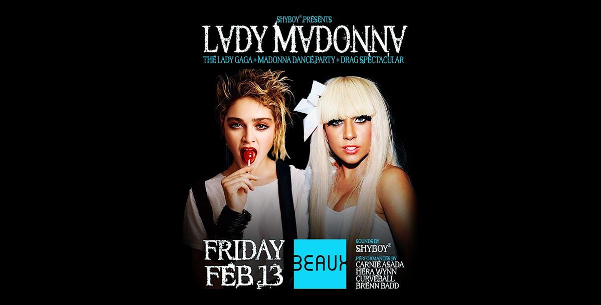 ShyBoy® presents the debut of LADY MADONNA: The Lady Gaga + Madonna dance party + drag spectacular @ Beaux SF on Friday, February 13 at 9:30 PM (after RuPaul's Drag Race)!