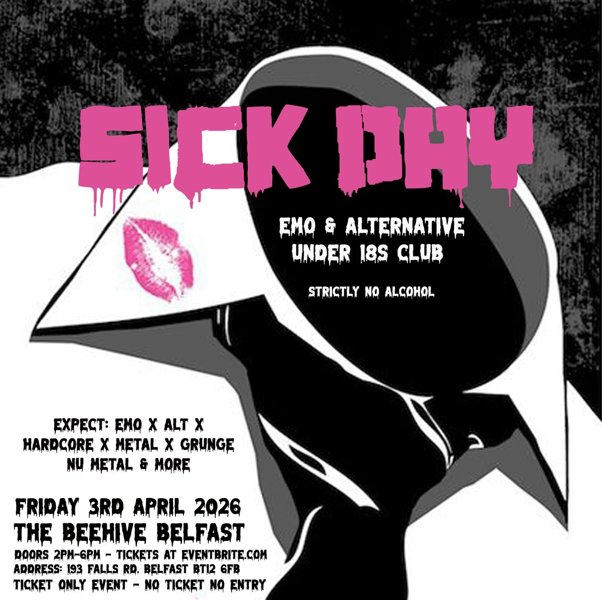 Belfast misfits, your Sick Day has arrived! 🤘🖤 Join us at The Beehive Belfast on Friday, 3rd April for the ultimate Under 18s Emo * Alt takeover. We’re spinning everything from MCR and Paramore to Slipknot and BMTH. 🎸 Doors 2PM - 6PM