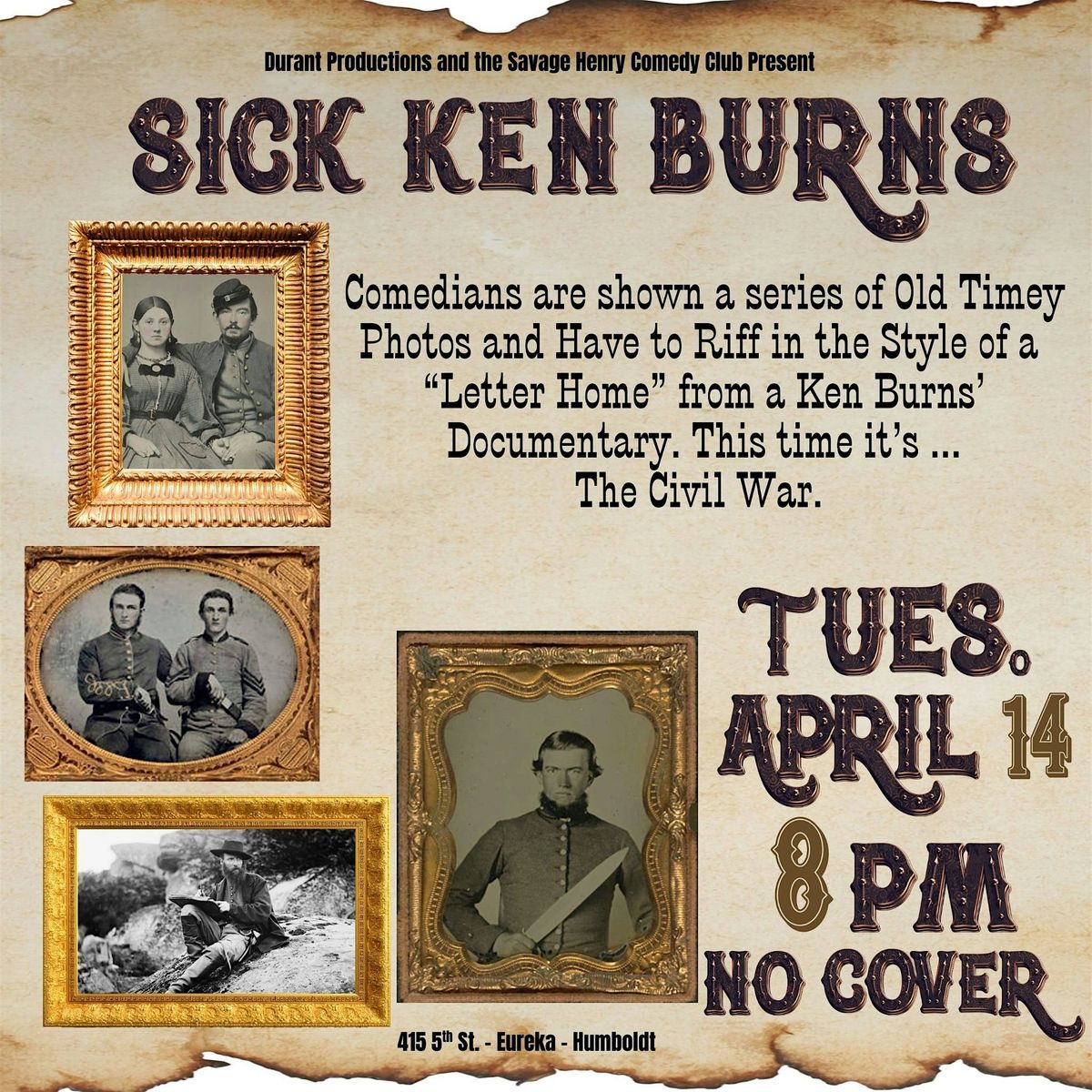Savage Henry's newest comedy show: Sick Ken Burns! Comedians are shown a series of old timey civil war era photos to riff on! Takes place in the style of "A Letter home" from a Ken Burn's documentary
