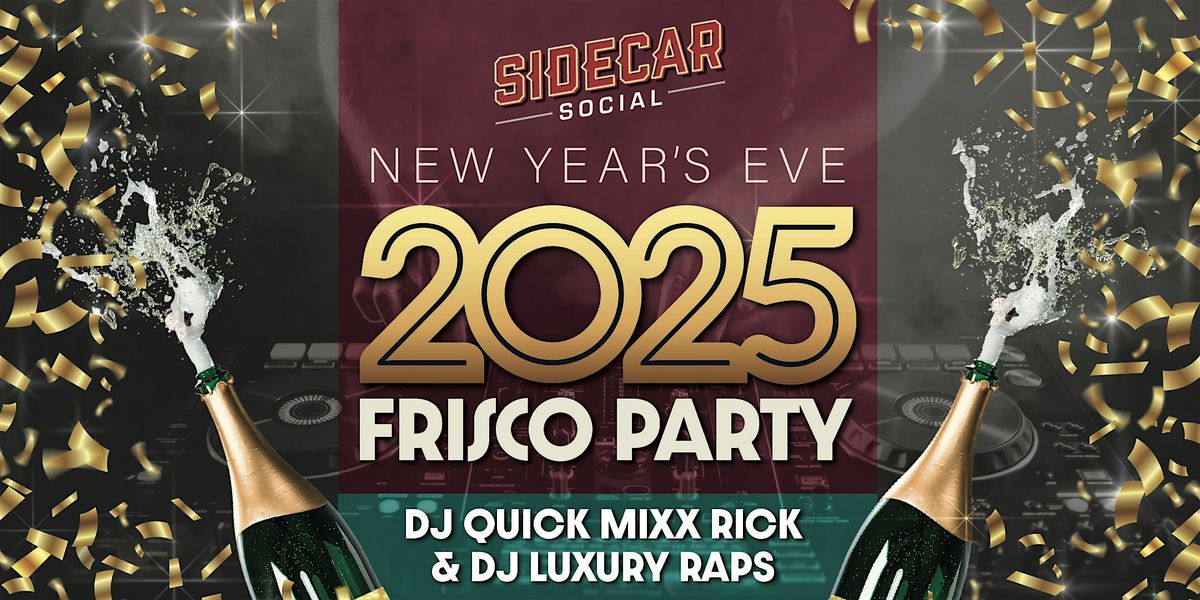 Go. All. Out. at Sidecar Social in FRISCO and kiss 2025 goodbye with live music at our epic New Year's Eve party. Catch the big countdown on our 18-foot screens, dance the night away with DJ Quick Mixx Rick and DJ Luxury Raps, and toast in 2026 with a complimentary glass of bubbles at midnight while balloons and confetti drop!