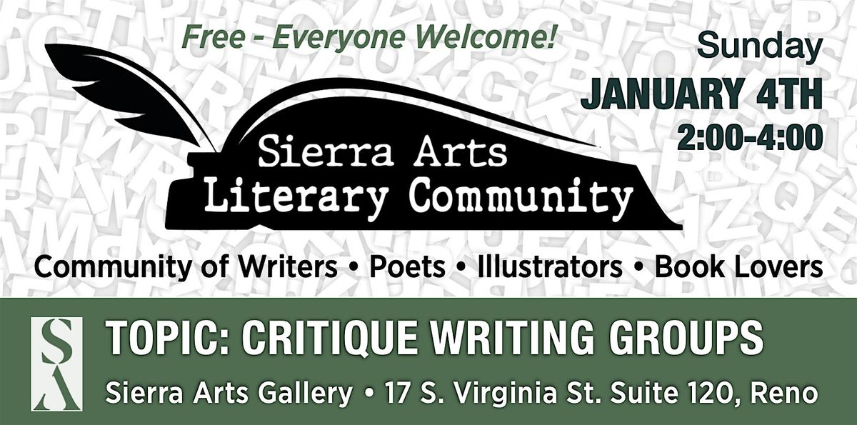 Sierra Arts Literary Community is hosting an engaging panel of writers with diverse experiences and perspectives on critique groups and their impact on the writing life. From discovering the benefits of joining a group to finding the perfect match for your writing style, our panelists will share practical advice and real-world insights. The discussion will also cover how to start and successfully run a critique group, as well as how to know when it’s time to move on. Whether you’re curious, committed, or somewhere in between, this lively conversation is designed to inform, inspire, and empower writers at every stage. This event is free and everyone is welcome!