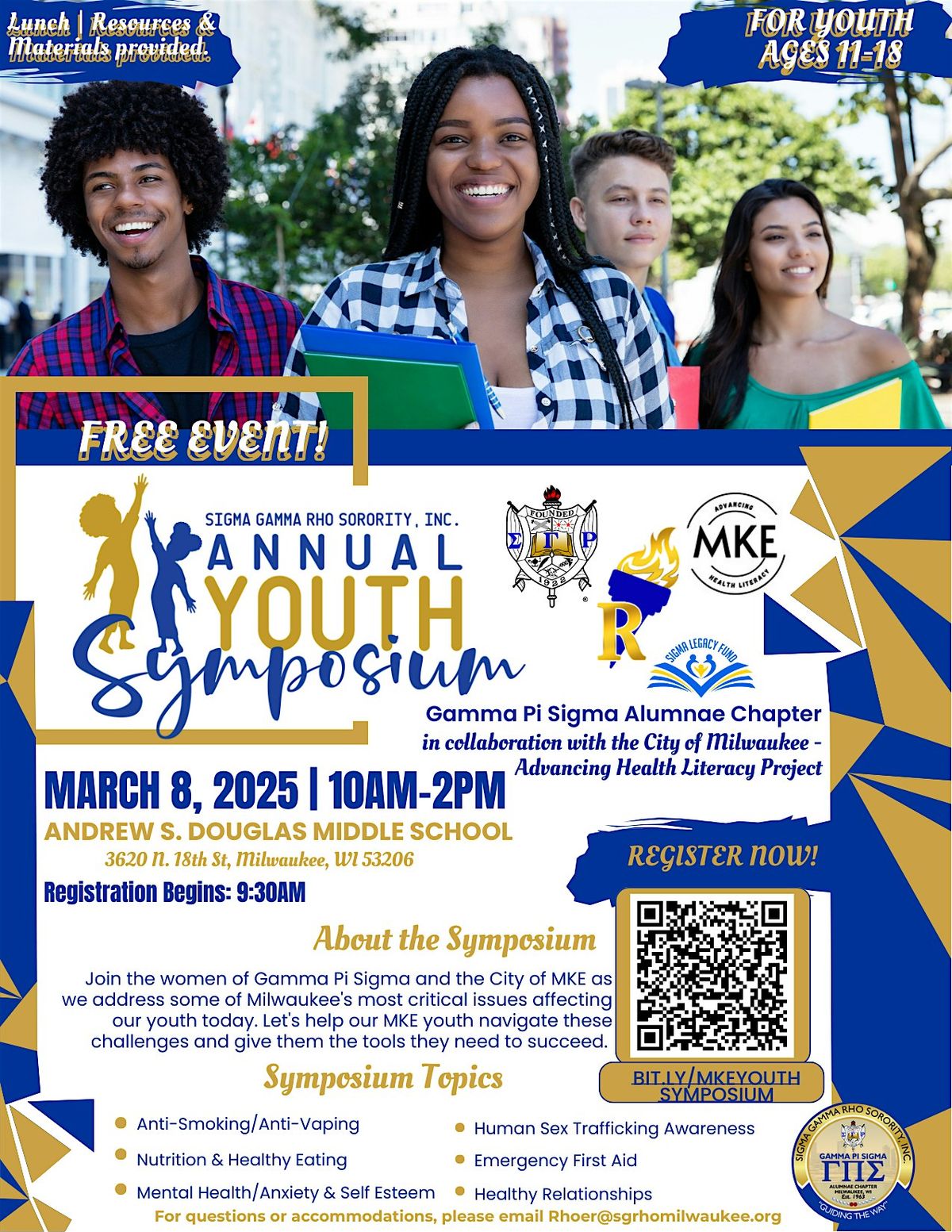 The Symposium empowers youth with resources and tools for success. Students have the opportunity to choose interactive workshops, collect career information, enjoy lunch, and walk away with resources they can use to improve themselves and the community. Parents, guardians, and community members are welcome to attend.