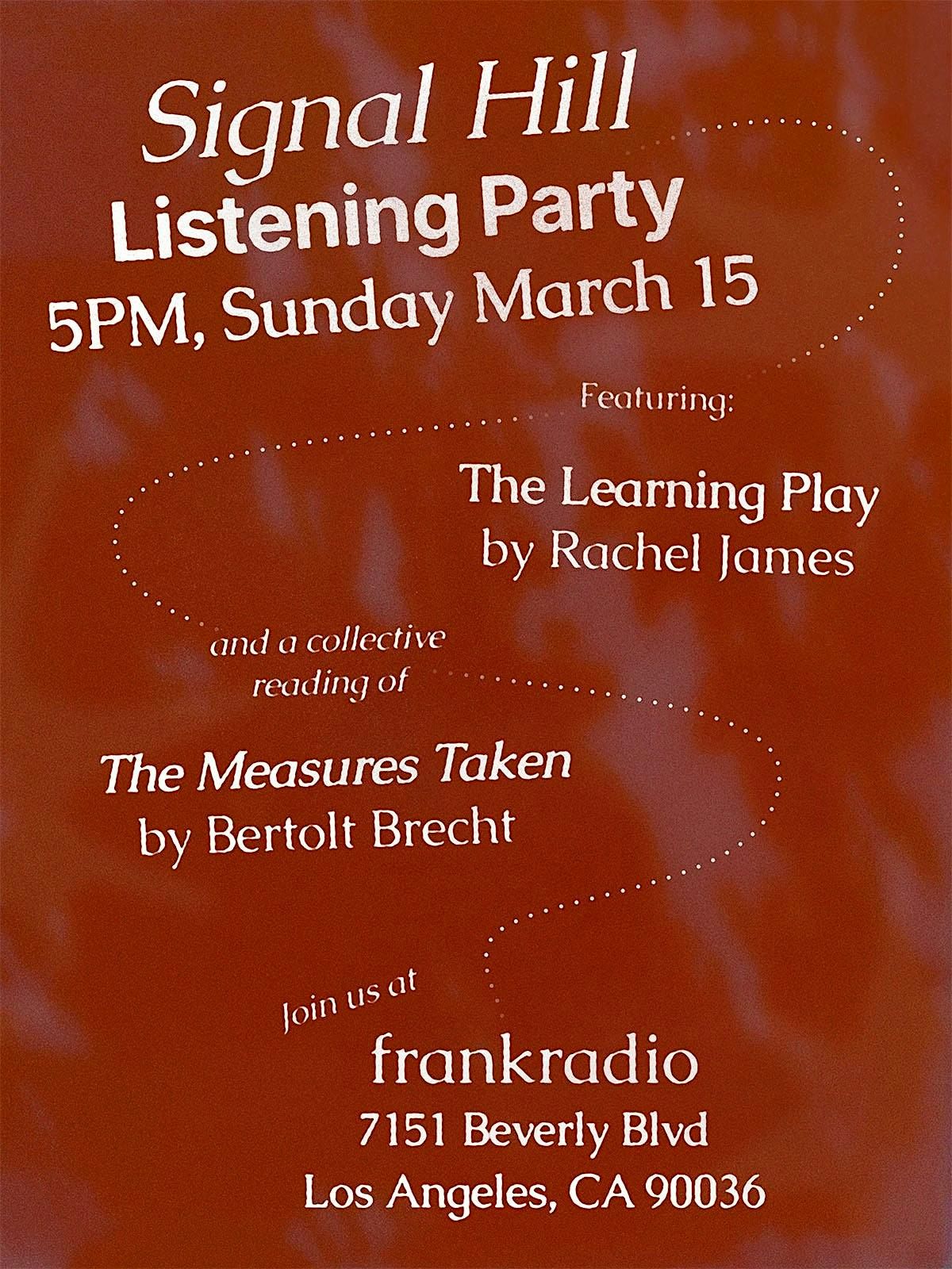 Named one of the best podcasts of 2025 by the New Yorker, the Atlantic, and the BBC, Signal Hill publishes audio documentaries of all kinds. Join us at frankradio to listen to Rachel James' Issue Two feature THE LEARNING PLAY, an experimental audio essay about organizing, art, and Bertolt Brecht’s The Measures Taken. After a quick break, we’ll read the short play together. Doors at 4:30, listening at 5! Free and open to all but space is limited — RSVP here.